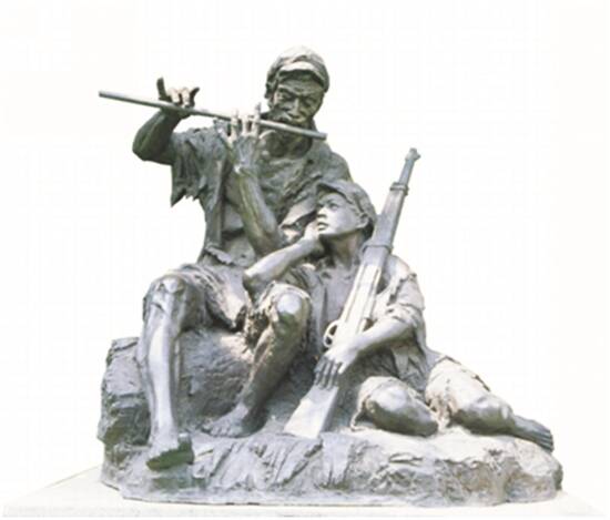 1956年,潘鹤先生受中央军委总政治部委托,为建军30周年美术展创作了这件表现第四野战军解放海南的雕塑。作品没有正面描写战争场景,而是侧面塑造了在艰苦斗争环境中吹笛的老战士和倾听笛声的男孩形象,在一老一少、艰苦与浪漫的对比下,将革命乐观主义精神与坚毅的信念感表达出来,极具震撼力。