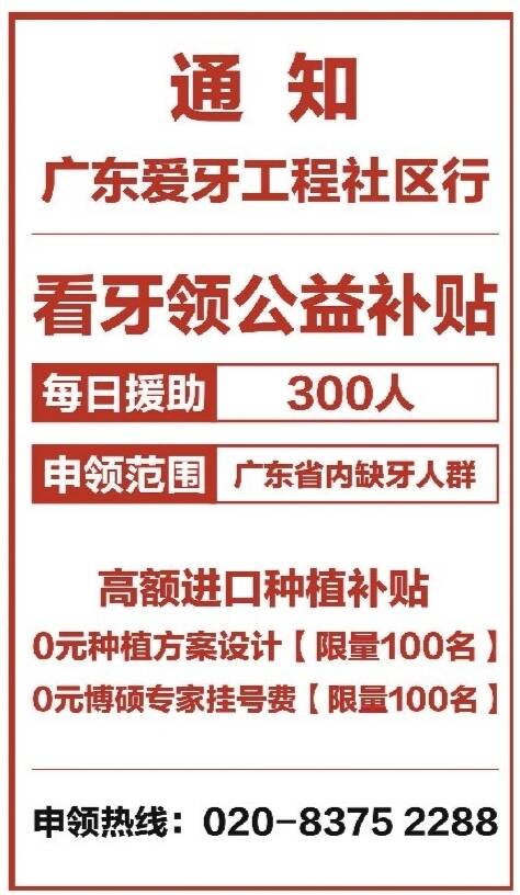 为进一步倡导世界卫生组织8020计划,推出“粤口腔健康”建设,由广东省临床医学学会协办指导,德伦口腔连锁作为承办单位及技术指定单位的“广东爱牙工程社区行”启动,针对缺牙、无牙等口腔问题。市民均可拨打020-8375 2288申领种牙补贴,助力广大市民拥有一口健康好牙。