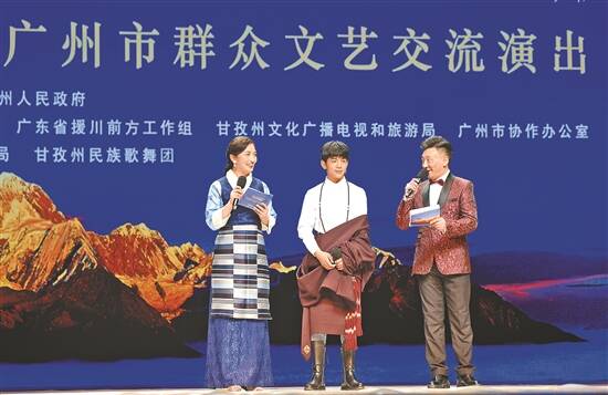 羊城晚报讯 记者黄宙辉、通讯员穗文广旅宣报道:23日晚,“脱贫攻坚感恩致谢——甘孜州赴广东省群众文艺交流演出”在广州友谊剧院上演。降央卓玛、亚东等甘孜州优秀歌手和舞蹈演员为羊城市民带来了一场独特的视听盛宴。前段时间火遍全国的甘孜州理塘县旅游大使丁真也随团参演。
