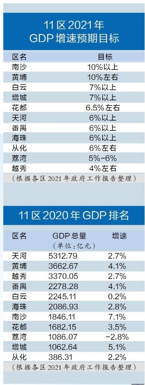 一年之计在于春。记者梳理2021年各区政府工作报告了解到,根据各自经济发展实际情况,结合广州市的经济增速预期目标,广州市各区在年初都明确了今年GDP增速预期目标。