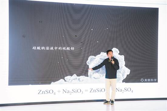 随后,罗天挚展示金属与盐溶液发生置换反应时生成结晶的过程,五颜六色的结晶向四面八方生长,“显微镜下,一个置换反应换一片‘森林’。”罗天挚说,“金属钠放入水中,直接观察,会产生‘浮溶游响红’的现象。但如果通过热成像观察,钠就摇身一变,成为横冲直撞的艳火,烧亮一大片原本暗淡的背景。”跟随罗天挚,同学们欣赏了色彩斑斓的氢氧化物沉淀、“法老之蛇”以及“化学花园”等化学实验。不同物质之间激烈地转化,被印刷在教科书的几百条方程式在同学们脑海中“活化”。