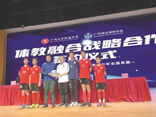 羊城晚报讯 记者蒋隽、通讯员梁苏健报道:3月22日下午,广州大学附属中学·广州城足球俱乐部体教融合战略合作签约仪式在广大附中(大学城校区)举行(见下图)。双方将共同打造体教融合新模式,在校园足球球员培养、校队共建、共享教育资源等多个领域展开全面合作。