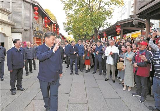 3月22日至25日,中共中央总书记、国家主席、中央军委主席习近平在福建考察。这是24日下午,习近平在福州三坊七巷历史文化街区考察时,向游客和市民招手致意 新华社发