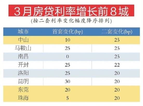 其中,珠三角、长三角热点城市利率增幅较大。贝壳研究院数据显示,3月,在60城中有10个城市首套、二套利率均上升。中山、东莞、珠海的二套房贷利率提高20个基点及以上,提升幅度较大。此外,开封、成都、洛阳、惠州首套利率在6%以上,位居60城前四名。