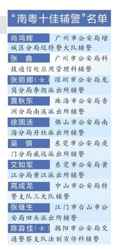 羊城晚报讯 记者张璐瑶、通讯员粤公宣报道:记者从广东省公安厅获悉,3月26日,省公安厅举行“南粤十佳辅警”“南粤辅警之星”发布仪式。广州市公安局增城区分局巡特警大队肖鸿辉等10名辅警获评“南粤十佳辅警”荣誉称号。