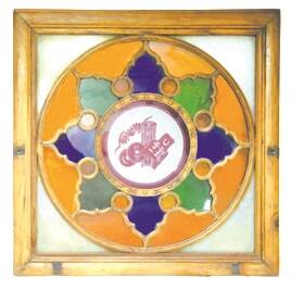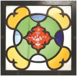 此窗采用“十字海棠”为格心主体。“海棠”开光在广式彩色玻璃窗中较为常见,因“棠”与“堂”谐音,故海棠纹有“满堂平安”之寓意。“十”字形格心样式图案,象征东西南北天地经纬,寓意为大地宽广。除“十字海棠”外,常见的格心样式还有十字如意、十字花、四方间十字等,既能起一种转换连接的作用,又是一种文字图案。