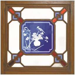 此窗中部八方形“海棠”开光内镶嵌了套蓝花草纹玻璃画,画中题材所依据的粉本应为“八大山人”所绘。广州工匠在传统技艺的基础上取长固本、洋为中用,将窗上套色玻璃画题材从洋花图案转变为国画、书法等中式图样,最终形成广式彩色玻璃窗融汇中西的风格特点。