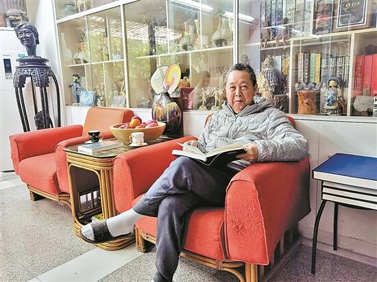 两盆枝丫上挂满红豆的树栽,一树硕果累累的“五福同堂”,及一盆盛放着“满天星”的盆植,是林墉先生家进门可见的几抹春色。隐于五羊新城中的这套房子,如果没有时不时地更换一些鲜花绿植带来些许变化,我觉得是走进了没有时间流转的静止空间,因为几十年来这里的一切似乎都没有变化,红木罗汉床、藤椅、书架,还有许多工艺美术品,一直都是那个老样子。