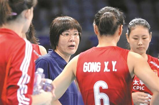主教练郎平(左一)和队员们讲球 图/视觉中国