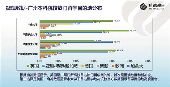 根据广东省各大高校发布的2019-2020年毕业生就业质量报告来看,2020年广州高校本科生的出国升学热度不减,除中山大学未出详细数据外,华南理工大学、广东外语外贸大学、暨南大学的本科生出国人数均占毕业生人数10%以上。