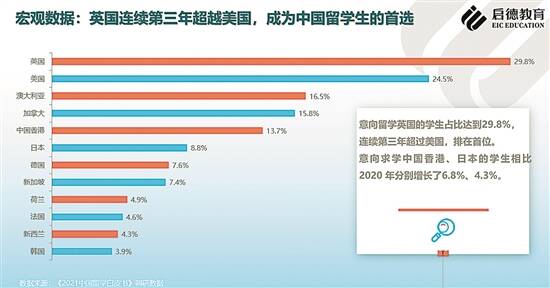 与此同时,英国已成为中国留学生的“香饽饽”。《白皮书》显示,2021年,意向留学英国的学生占比达到29.8%,连续第三年超过美国,排在首位。意向求学日本的学生相比2020年增长4.3%。同时,德国、新加坡、荷兰等此前相对小众的留学国家也渐渐被更多留学生所青睐。