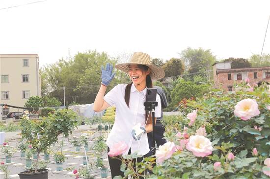 在北界镇石砚村诗人种植家庭农场,场内各个品种的月季花开得灿烂,有主播正在直播带货,十几名工人正在打包发货。目前,该场种植的进口高档月季花已扩展到130多亩,繁育花苗大棚10个,繁育花苗10多万株。在办公室旁边,两株“粉色龙沙宝石”犹如一个大花球。这个过去在广东、广西、福建地区难以开花的品种成功在这里培育,被场主黄英强津津乐道。