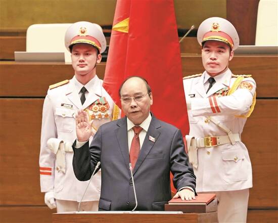 5日,新当选的越南国家主席阮春福在首都河内宣誓就职 新华社发