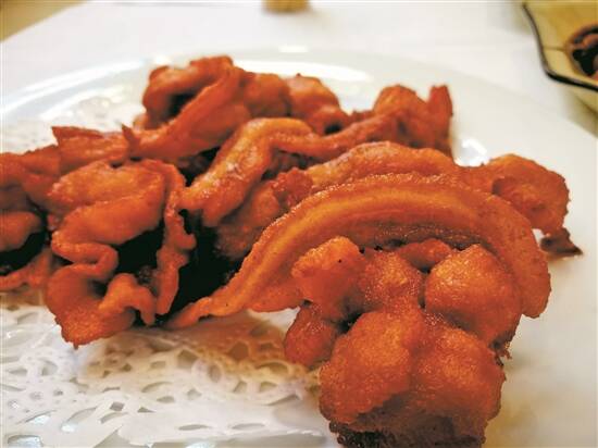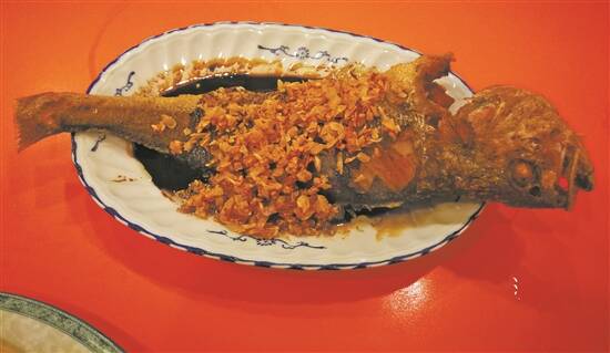 豉油糖炸黄花鱼是雅苑的招牌菜,几乎每桌必点,外皮酥脆、内里细嫩,碟底的酱油以及铺满鱼身的炸蒜粒都令其风味更为独特。