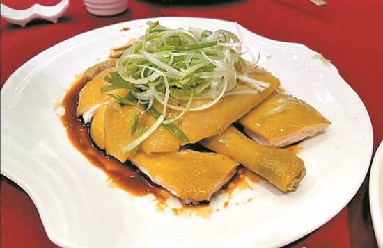 葱油鸡是雅苑的另一道拿手菜,只用葱油简单调味,鸡被满满的红葱头覆盖,闪烁着被葱油浸润的光泽,入口鸡味、葱味分明和谐,鲜甜又鲜嫩。