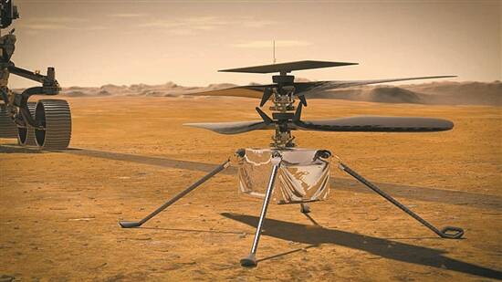这架直升机在地球上的重量只有约1.8千克,机身大小和一个普通的纸巾盒差不多。4月前,它已经顺利地从“毅力”号火星车腹部被释放到火星表面。