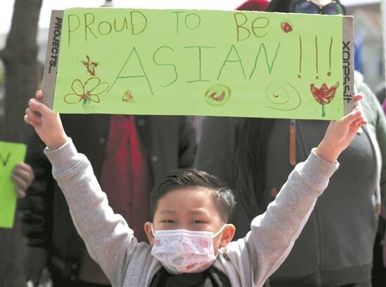 在美国加州,一名男孩日前手举标语参加抗议歧视亚裔的集会 新华社发