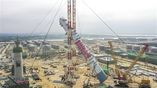 羊城晚报讯 记者赵映光、通讯员林碧鸿摄影报道:17日上午11时28分,在揭阳大南海石化工业区广东石化炼化一体化项目建设现场,总重达4606吨的亚洲最重单体钢制石化塔器抽余液塔在历时3个半小时后被成功吊装就位,该塔的顺利就位刷新了亚洲最重塔器吊装纪录。