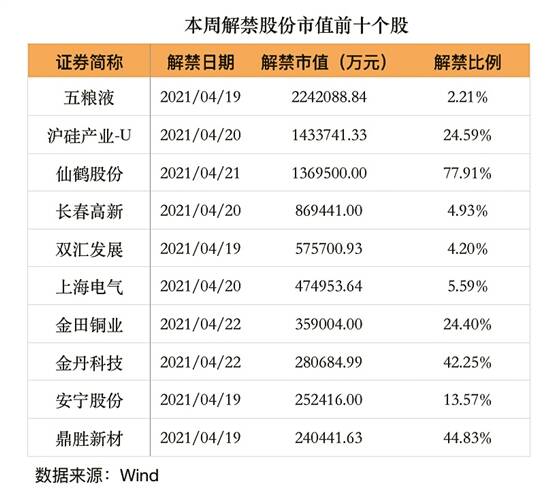 本周解禁压力暴增。整体来看,包括五粮液在内,本周共有26家公司合计36.39亿股限售股解禁上市,解禁市值902.48亿元。其中,本周限售股解禁数量超过1亿股的上市公司合计有7家,分别为上海电气、沪硅产业、仙鹤股份、金田铜业、精工钢构、鼎胜新材、双汇发展。