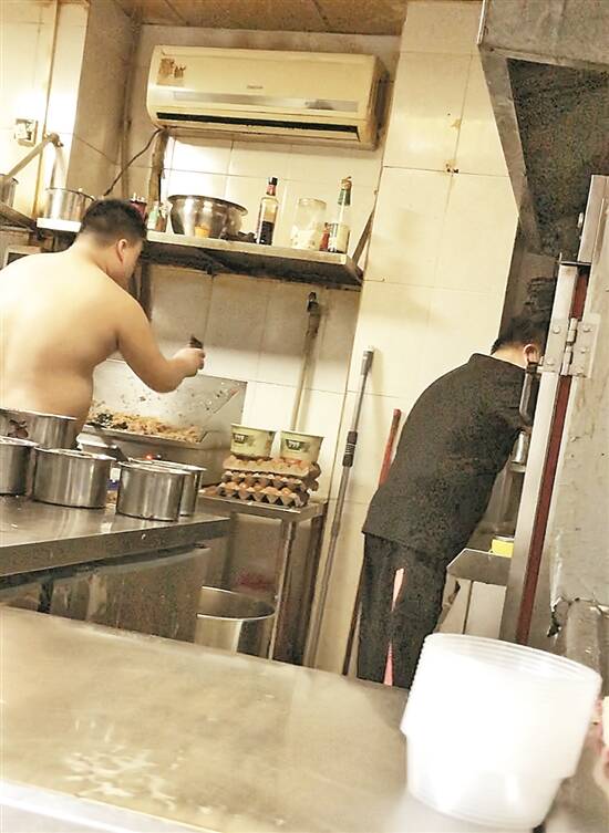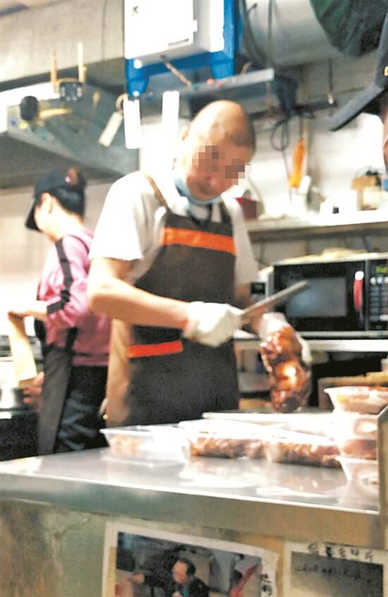 除了不按规定戴口罩、手套外,个别店内员工的卫生习惯也让人一言难尽。在记者隐蔽拍摄的视频中,大厨师光着膀子炒菜、一边口水四溅说话一边斩熟食的场景不一而足。