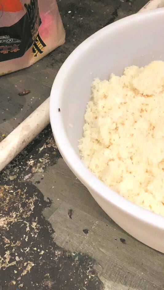 到店的第一件事是煮饭。就在记者跟着店员柒先生到食材准备区舀米煮饭时,明显看到米袋下方躺着一只死蟑螂,再往左边墙角一看,离米袋十几厘米处亦躺着一只死蟑螂。米饭煮好后,记者把饭倒到大盆里,蹲在大盆旁边加醋用力搅拌时,在米袋旁边发现了第三只死蟑螂。