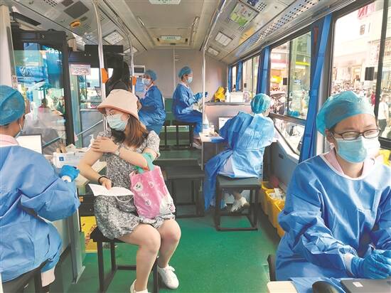 羊城晚报讯 记者崔文灿摄影报道:昨日下午,一台特别的公交车开进了广州北京路步行街——这是全市首台由公交车改装而成的标准化新冠病毒疫苗流动接种车,市民在这里接种疫苗无需预约,只需一张身份证,说打就打,这让不少前来接种的市民直呼“太方便”!