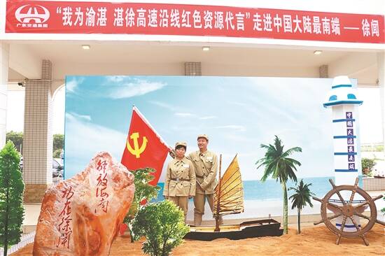“您好!这是渡海作战时中国人民解放军第四十三军一二七师所使用的军号……”12名刚在启动仪式上获颁“红色资源代言人”聘书的湛江高速文艺轻骑兵,在“解放海南 功在徐闻”的渡海作战故事主题展板前,分别用普通话、粤语、雷州话,为服务区现场的人们讲述徐闻船工在解放海南岛战役中的故事。