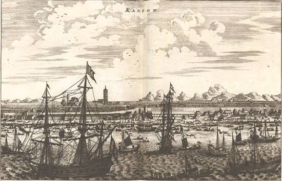 《从珠江江面远眺广州城景图》 制图者:[荷]纽荷夫 制图年代:1665年 原件收藏机构:哈佛大学图书馆 由澳门科技大学图书馆复制并提供