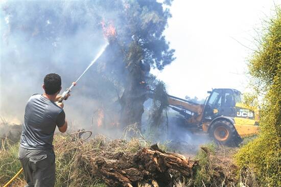 11日,以色列一男子试图扑灭因加沙地带火箭弹袭击引发的火灾