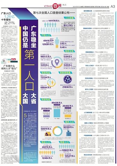 第七次全国人口普查数据显示,广东在此次人口普查中揽下多个“第一”:连续14年常住人口规模居全国第一;和2010年第六次全国人口普查时相比,广东新增人口总量位居全国第一;同时也是港澳台居民和外籍人口居住人数最多的省份。