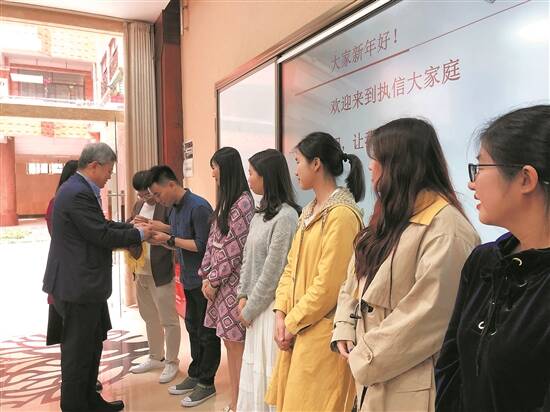 执信中学新教师培训,校长给新老师发校徽 (资料图片)