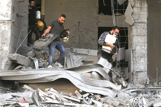 12日,在以军空袭后的加沙城,人们从废墟中取出个人物品 新华社发