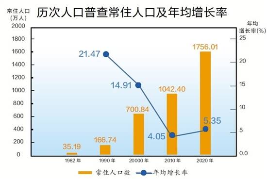 根据公报,深圳全市常住人口为17560061人,与2010年第六次全国人口普查的10423973人相比,十年共增加7136088人,增长68.46%,年平均增长率为5.35%。全市共有家庭户6424556户,其中家庭户人口为14480695人。平均每个家庭户的人口为2.25人,比第六次全国人口普查的2.12人增加0.13人。