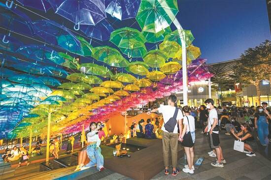 天环广场再次在户外广场玩出新鲜,“520”期间,天环在户外大楼梯处设置了“炫闪天空”的场景,多种颜色的雨伞悬挂在天空,入夜后将呈现多彩的浪漫气氛,吸引情侣打卡留念,而在L2户外连廊处,也有“追蝶星河”。此外,多个化妆品品牌在天环的户外广场设置了快闪店,一到晚上,便有不少情侣在此“排长龙”试用。