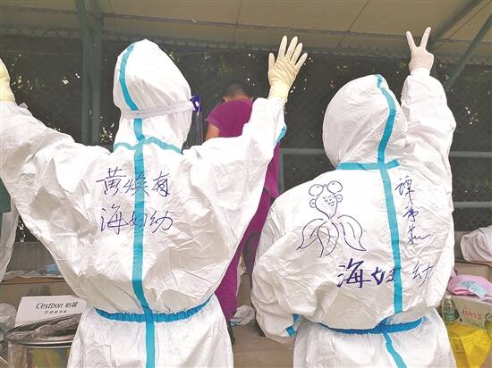 羊城晚报讯 记者周聪、通讯员李玉红摄影报道:“妈妈,你看,他们背上的卡通好可爱。”儿童节当天,一个小朋友指着广州鹭江运动场的一名穿着防护服的医护人员这样说道。在现场,记者发现,海珠区妇幼保健院核酸检测组医护人员的防护服上都画有卡通(见图),“战力”满满。