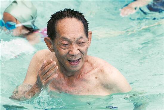 游泳是袁隆平一生的爱好。图为2007年,77岁的袁隆平在泳池中 图/视觉中国
