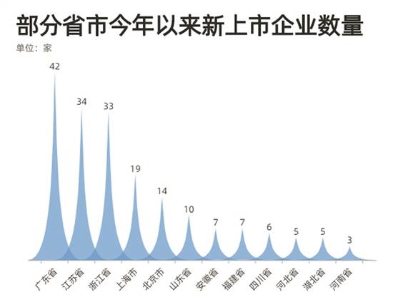 从注册地上看,在200家新上市企业中,最多的企业来自广东,共有42家,占总数的21%。共有128企业来自广东和江浙沪,珠三角和长三角两大区域贡献了超过六成的新上市公司,成为新股资源扎堆地区。广东企业以42家位居首位;江苏和浙江紧随其后,新上市公司数量分别为34家和33家,占总数的比例分别是17%和16.5%。上海和北京申请企业分别为19家和14家,排在第四位、第五位。