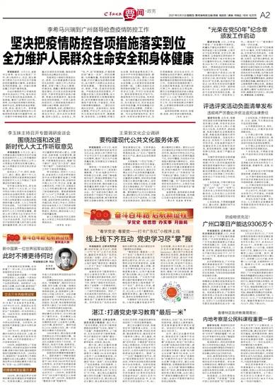 在越秀区六榕街旧南海县社区,李希、马兴瑞看望慰问奋战在社区防控一线的工作人员和志愿者,详细了解人员出入管理、环境消杀、佩戴口罩等防控措施落实情况,对大家主动投身疫情防控、不辞辛劳连续作战表示感谢,希望大家再接再厉,落实落细各项防控措施,广泛深入宣传防疫知识,以周到细致的服务引导群众减少聚集、做好防护。