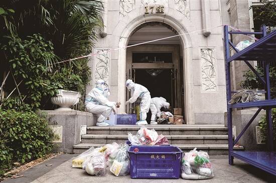 黄璐告诉记者,目前,包括医生、警察、社区工作者、志愿者、物业工作人员在内,每天共有约400多人对锦绣半岛东区进行保障。对于17栋被要求足不出户的居民,他们所需的生活物资需经过三批工作人员的手,才能到达他们家中,“首先是小区门岗处的工作人员代收,然后由工作人员的三轮车转送到楼下,再由穿着防护服的物业工作人员送上楼”。