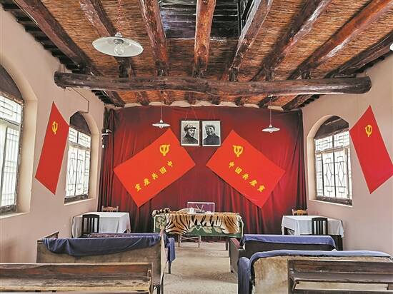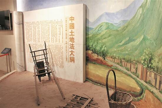 在模拟的土地会议的场景前,解说员闫文艳向记者介绍,当时土地会议的会场非常简陋,主席台就设在一个旧房基上,在上方搭建了一个用来遮阳的布棚。参加会议的代表都是自带板凳,没有板凳的代表就坐在石头上参加会议。