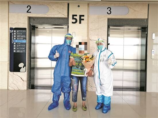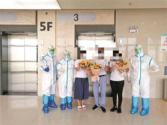 今早,医生送别达到出院标准的确诊患者何某和解除医学隔离观察的两名无症状感染者 穗卫健宣 供图