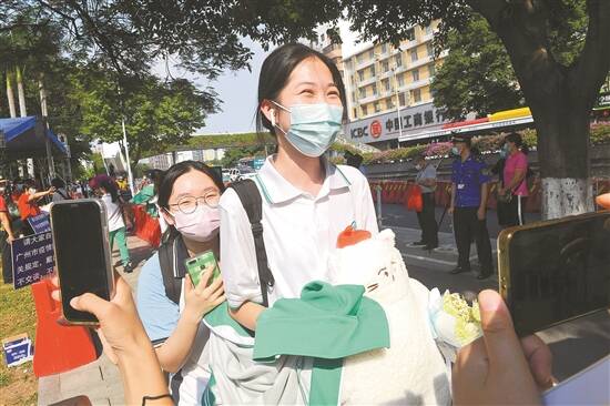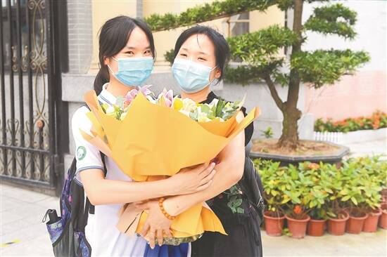 在广州市第七中学考点门口,不少家长手捧鲜花翘首以盼。走出考场的考生或笑容满面,或与家长来一个击掌或拥抱,还有的用手做出胜利、跳跃的姿势,展示出自信、乐观的心态,生们以各自独特的方式告别高中时代。
