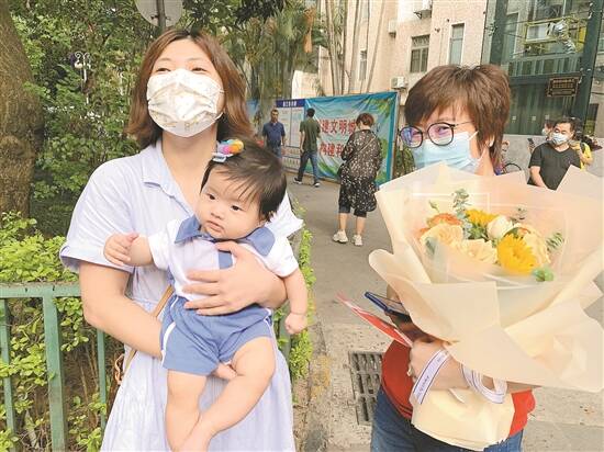 身穿“校服”的小婴儿跟家长一起接考 沈婷婷 摄