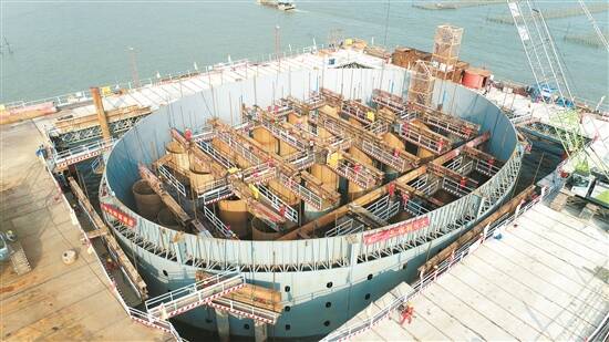 钢套箱是主墩承台施工的围水结构。此次下放的钢套箱总高度达10米、双壁间距1米,套箱底部面积约1250平方米,相当于3个篮球场大小。后续将浇筑封底混凝土,抽排钢套箱内的海水,形成一个大型的无水围堰。