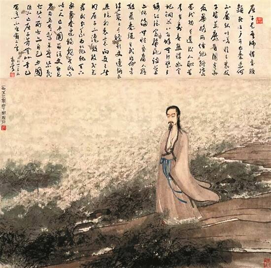 现代绘画大师傅抱石对屈原情有独钟,多次为屈原画像,将其爱国情怀、忧患意识刻画得生动传神,栩栩如生。1942年,郭沫若曾为傅抱石的屈原画像题跋长诗,堪称珠联璧合。