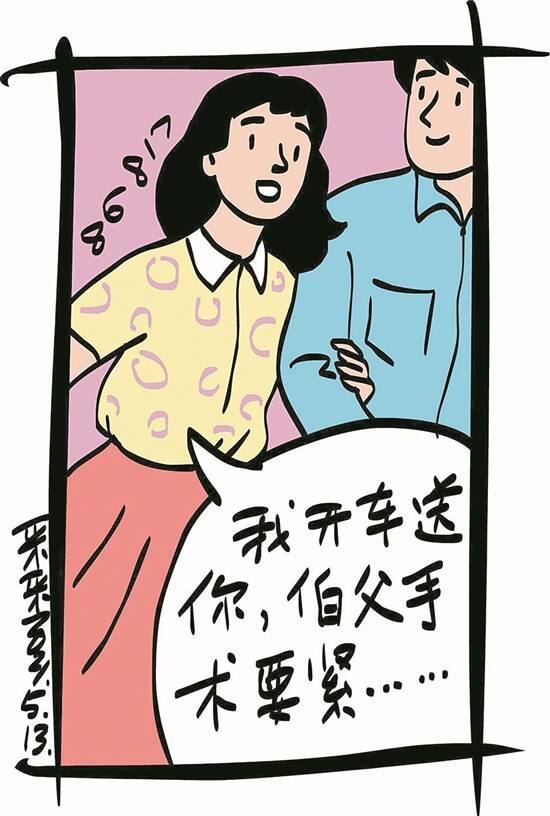这时,庄子轩的手机响了,是医院打来的,说病人情况危急,必须马上手术。冷清清听了,拉着庄子轩就向外跑,边跑边说:“我开车送你,伯父手术要紧。”庄子轩张了张嘴,却没能说出话来,只觉得一股暖流涌遍全身……(熊燕)