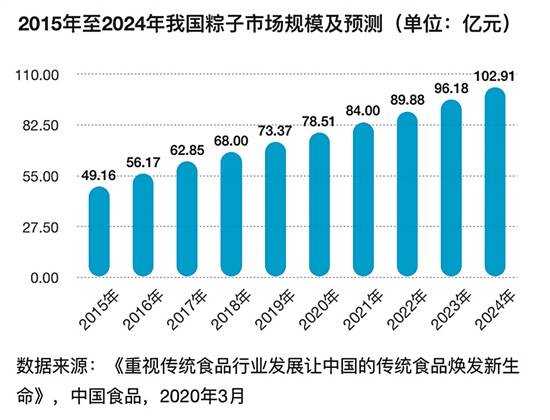 小小粽子也有大市场。据统计,2015年我国粽子市场规模为49.16亿元,到2019年增长至73.37亿元,年复合增长率达10.53%,预计到2024年我国粽子市场规模将增长至102.91亿元。