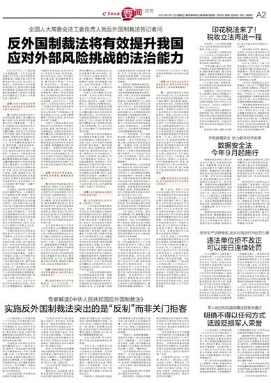 全国人大常委会适应加快推进涉外立法的要求,在较短的时间里,起草、审议并通过了反外国制裁法,这是反击某些西方国家霸权主义和强权政治的迫切需要,是维护国家主权、安全、发展利益的迫切需要,是统筹推进国内法治和涉外法治的迫切需要,具有重要现实意义和长远意义。法律的出台和实施,将有利于依法反制一些外国国家和组织对我国的遏制打压,有力打击境外反华势力和敌对势力的嚣张行径,有效提升我国应对外部风险挑战的法治能力,加快形成系统完备的涉外法律法规体系。