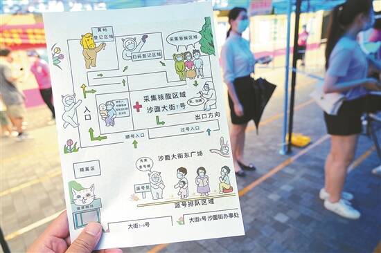 地图的设计者、沙面街志愿者刘子媚告诉记者,希望通过这种接地气的、可爱的手绘地图,让街坊群众更清晰了解整个核酸检测的流程。“事实上,我之前因为接触过次密接者,现在正在居家隔离。虽然不能出去,但在家通过画画也可以为防疫工作做点事,我很开心。”