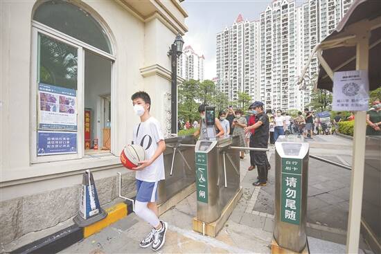 14日中午1时,广州市番禺区洛浦街锦绣半岛东区解封,居民陆续下楼,有序走出小区 羊城晚报记者 宋金峪 罗仕 摄